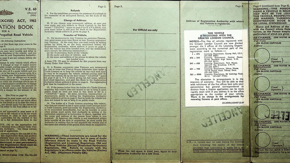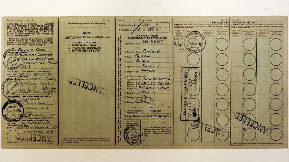 These Mini’s were registered to Brydor Cars right after the Christmas Break, but in England, every business used to close on Christmas eve - Dec. 24th, at midday, and open up again on January 2nd, however Christmas Day in 1966 was a Sunday so all work would finish on Friday December 23rd, and open up on Monday January 3rd. The Minis would be in a queue of cars registered before Christmas, so they would not get touched till January 5th 1967 at the Ministry of Transportation offices. Brian would then wait for them to be mailed back to his office which could take a week or two after the Christmas break and then he would have to transfer ownership from his Byrdor company back to himself, and mail them in again which is why he didn’t get ownership stamped until January 30th. It wasn’t important because these were not documents kept in the vehicles, they only were needed if the car was to be sold.